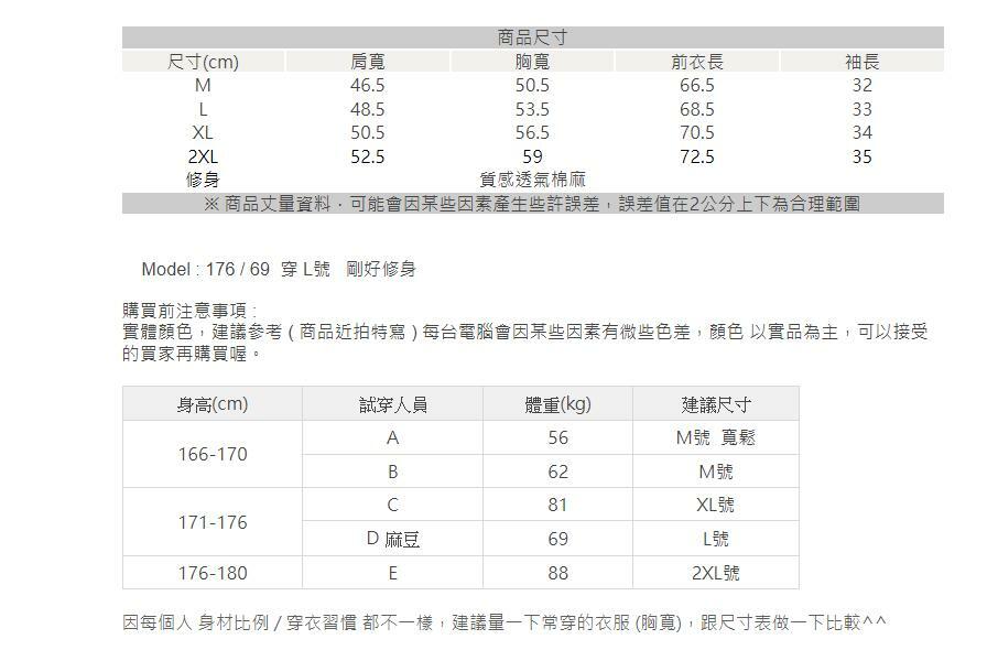 五分袖 / 亨利領 / 下擺圓弧 / 多扣 / 半開襟 / 質感透氣棉麻 / 前短後長 / 修身